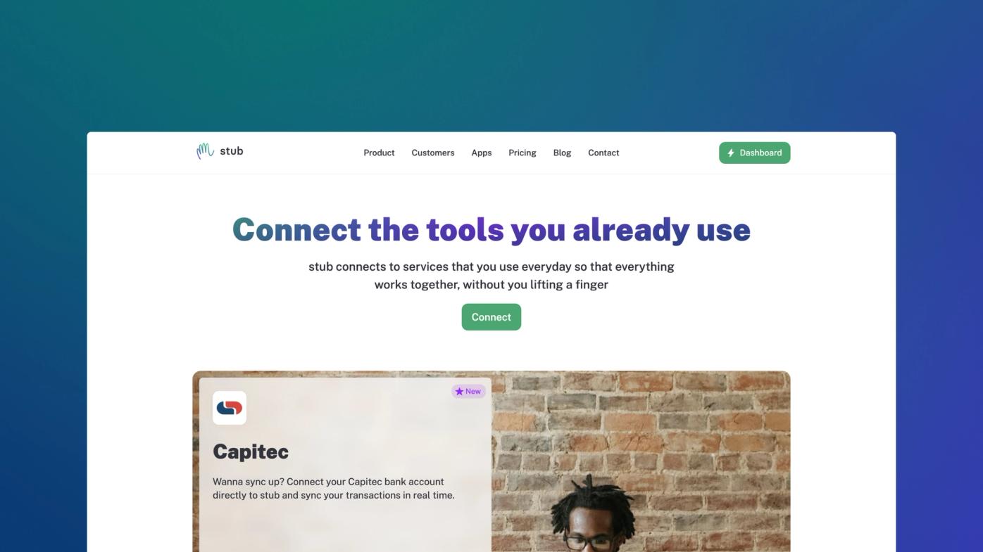 The stub marketing site got a fancy new page (oooooh 💅) called "apps". Here, you'll find all the connected tools (bank accounts, payment providers, sales tools, and services you already use) that you can link up to stub. You can also request new ones that you'd like. Hit us up. We're listening.