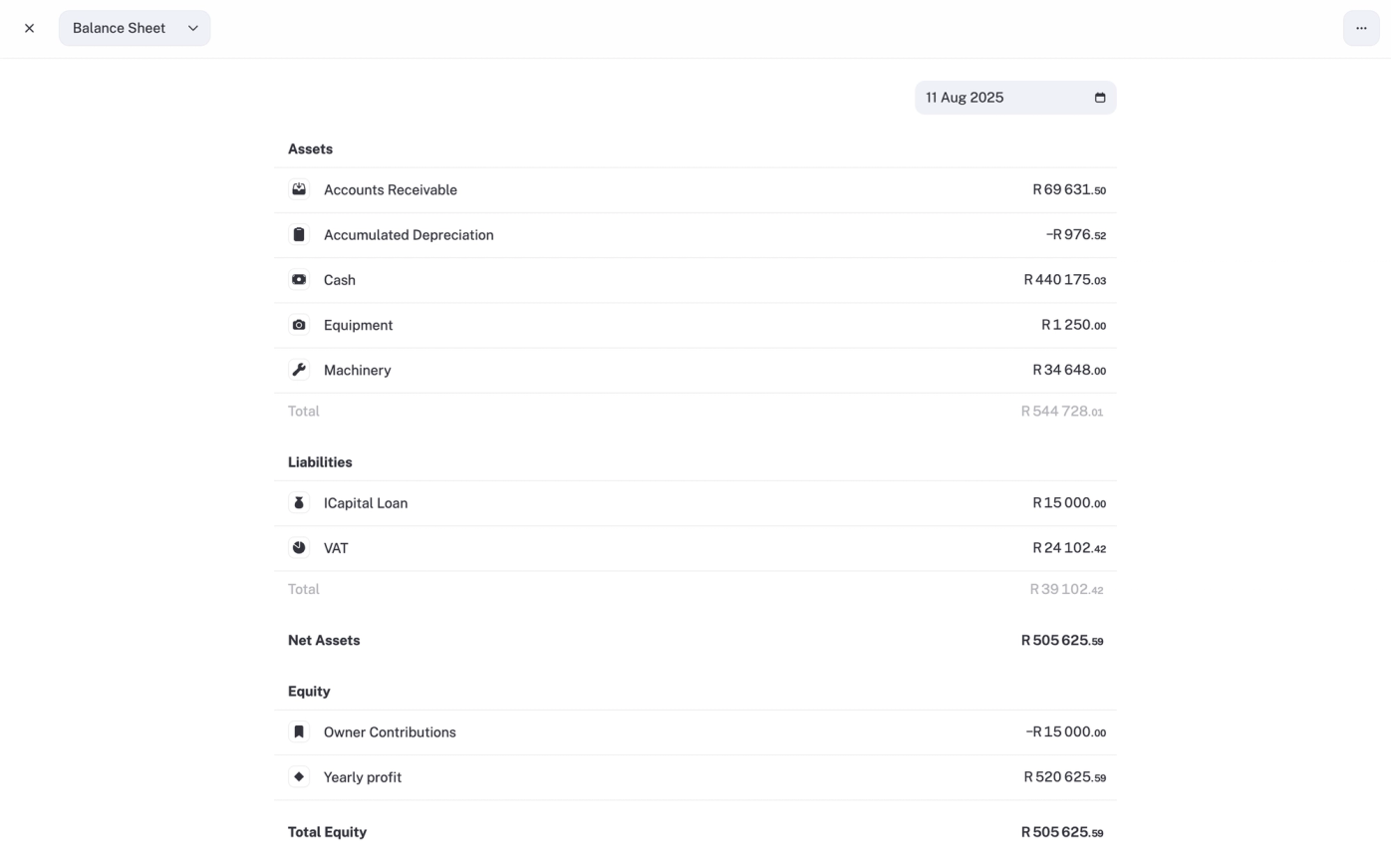 Example: R100,000 assets minus R65,000 liabilities = R35,000 equity. That is the salon’s “real” worth on paper.