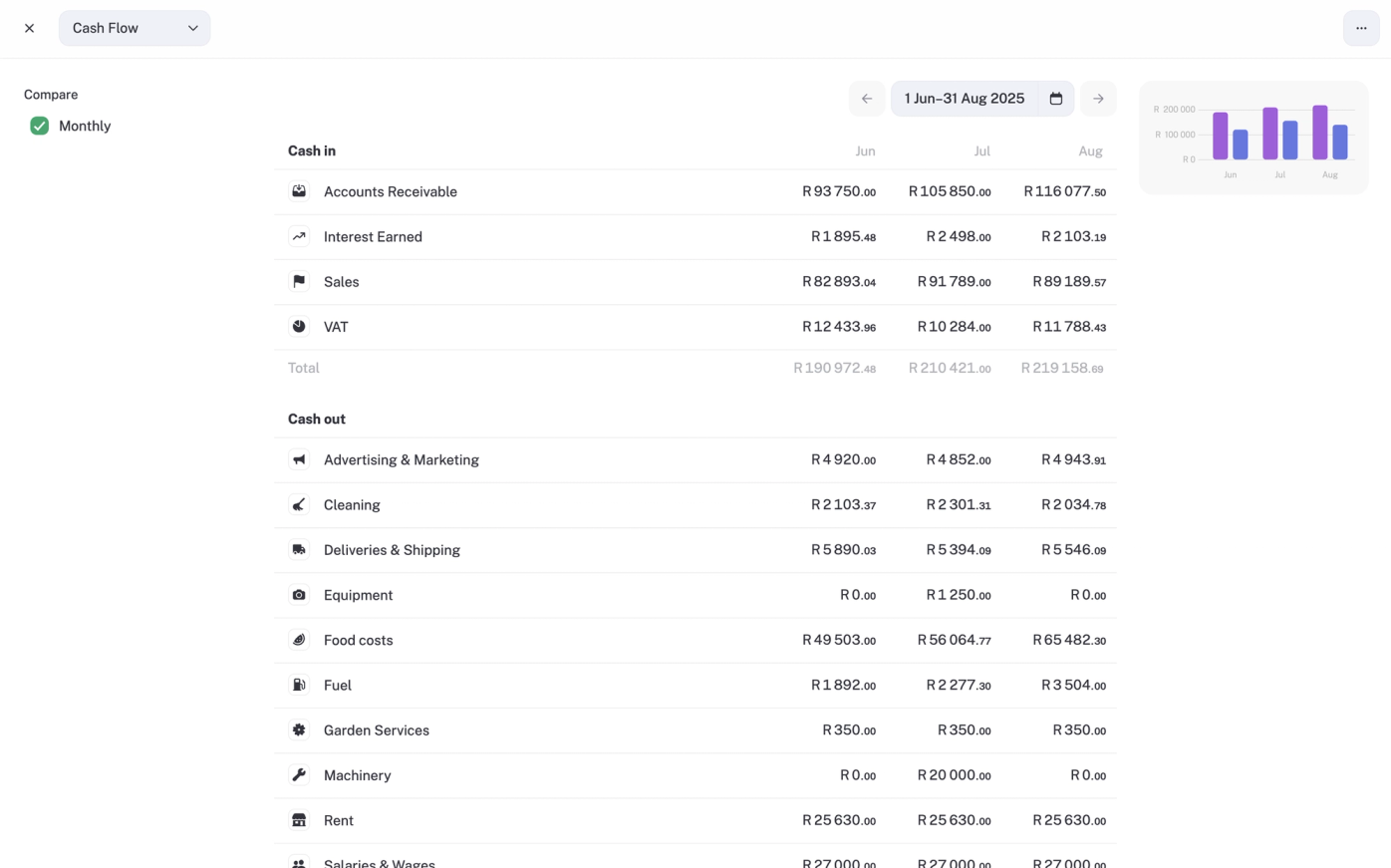 Example: The salon invoices a bridal party R10,000 in May. The P&L shows May income of R10,000, but the Cash Flow report only shows it in June, when payment arrives.